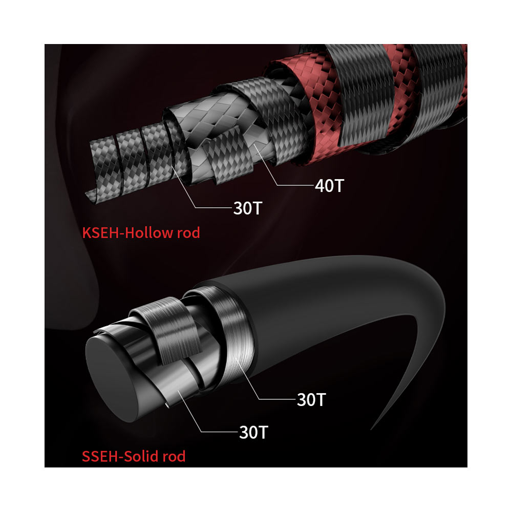 Haiz Series Hollow Slow Jigging Rod. Thanks to the high tonnage carbon blank, Fuji Alconite guides and lightweight Fuji reel seat, the whole rod is light enough for a long-time fishing. KSEH series is hollow with 30T and 40T carbon cloth wrapped. Hollow KSEH series adopt 30T carbon cloth and outer is wrapped by 40T carbon cloth. The hollow blank makes the rod easier to hold. The SSEH series are solid. The solid 30T carbon blank with well-adjusted taper can reduce the use of unnecessary material to make the whole rod lighter. The blank made of high tonnage carbon fiber has a better conductivity. The Fuji guides adopted can effectively reduce the friction between fishing line and rod. Meanwhile, the 37 action ensures a high sensitivity. As a result, the bite signal can quickly transmitted to the angler to better control the rod. The scientific distribution of carbon fiber can greatly improve the rod strength, which helps to quick get the fish back.KSEH is a hollow blank with 40T carbon cloth wrapped, which can effectively reduce the anti-shock force of the blank caused by rebound. Full Fuji Alconite guides have the advantages of light weight, high strength, good wear resistance and strong heat dissipation, which can greatly reduce the wear and tear caused by gravity or long-time operation. The comfortable and durable Fuji reel seat is non-slip, firm and strong. The X45° crossed inverse fiber in the ferrule guarantees an excellent performance in torsion resistance, shock and multi-angle impact resistance. The vacuum seamless joint makes it easier to pull out and insert the rod tip. The advanced translucent ruby red painting retains the original vision and touch feeling of the carbon belt, and fully shows the texture of decorative cloth under different light. The hollow metal fortresslike reel seat cap is more novel and textured.